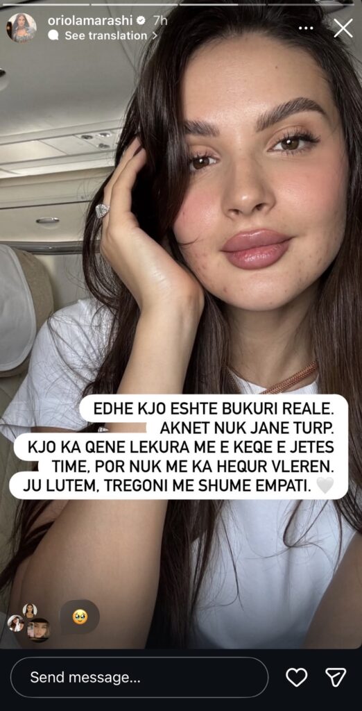 Modelja e njohur shqiptare Oriola Marashi ka ndarë me ndjekësit një foto të saj në “story”, ku shfaqet natyrale dhe pa filtra. Postimi është shoqëruar me një mesazh të drejtpërdrejtë dhe domethënës:“EDHE KJO ËSHTË BUKURI REALE. AKNËT NUK JANË TURP. KJO KA QENË LËKURA MË E KEQE E JETËS TIME, POR NUK MA KA HEQUR VLERËN. JU LUTEM, TREGONI MË SHUMË EMPATI.” Ky reagim i Oriolës vjen në një moment kur në rrjete sociale është diskutuar gjerësisht pamja pa makeup e banores së “Big Brother VIP”, Stelinës, duke rikthyer vëmendjen te presioni mbi pamjen fizike dhe standardet e bukurisë. Mesazhi i modeles drejtuar ndjekësve shërben si një thirrje për më shumë mirëkuptim dhe mbështetje mes vajzave, në frymën e “girls supporting girls”.